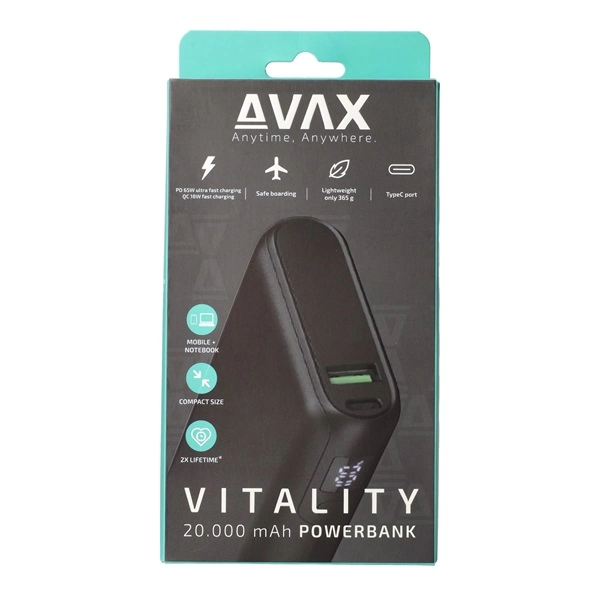 AVAX PB202B VITALITY 20000mAh Type C/PD 65W+QC18W gyorstöltő fekete power bank