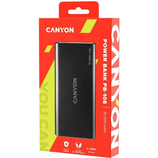 Megj.: CANYON PB-108 Power bank 10000mAh Li-poly battery, Input 5V/2A, Output 5V/2.1A(Max), 140*68*16mm, 0.230Kg, BlackCompact power bank