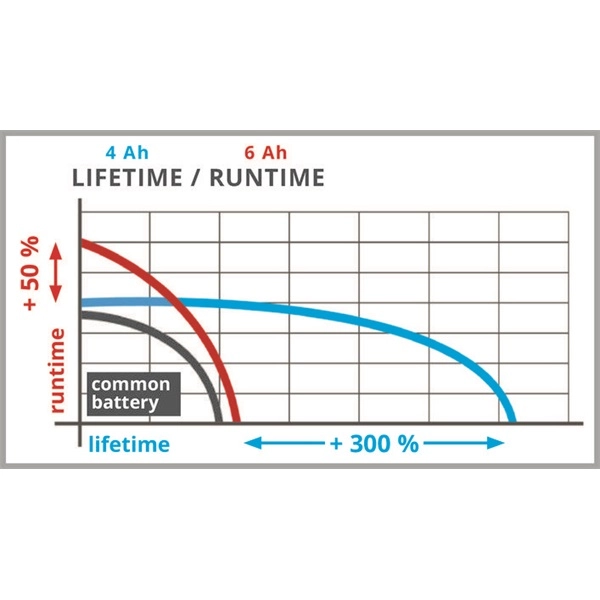 • MULTI-Ah technológia: 6 Ah (max. teljesítmény) és 4 Ah akkumulátor (hosszú élettartam) üzemmódok közül választhat