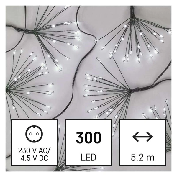 termék: lánc, fény színe: hideg fehér, méretek: 5,2 m, használat: beltéri, időzítő, távvezérlő: nem, funkció: világít, tápellátás típusa: AC (hálózati) adapter, forma: nano, LED-ek száma: 300, LED mérete: 3 mm (nano), tápvezeték hossza: 3 m, a fa magasságához: nincs megadva, kábel színe: zöld, fogyasztás: 4,5 W, bemeneti feszültség: 230 V AC, kimeneti feszültség: 4,5 V DC, csatlakoztatási lehetőség: nem, védettség: IP20, élettartam: 10 000 óra, anyag: fém, garancia-időszak: 2 év, értékesítési csomagolás: 1 db, dobozElérhetőség: Nem kapható