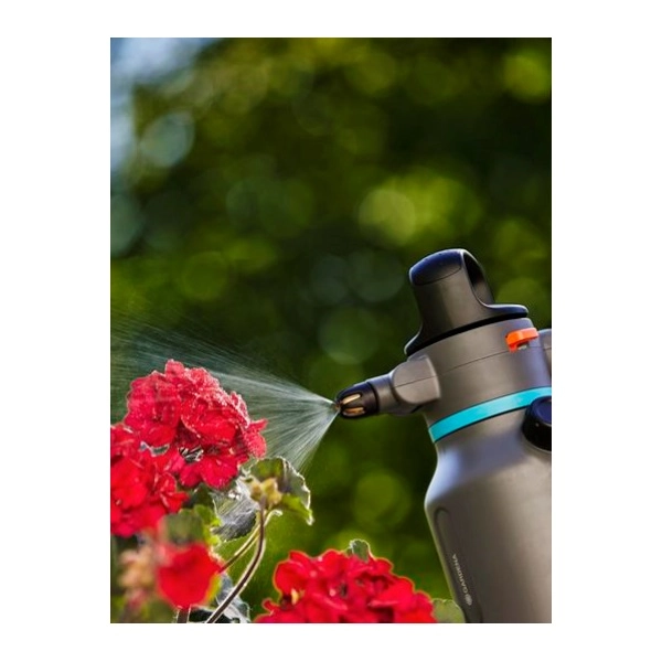 A GARDENA 1,25 literes nyomáspermetezője ideális választás az erkélyen vagy a teraszon levő növényeid gondozásához. Számos hasznos funkció biztosítja az egyszerű kezelhetőséget és a nagyfokú kényelmet, függetlenül attól, hogy öntözni szeretnéd-e a növényeidet, vagy további védelmet nyújtani azoknak egy saját készítésű rovarirtó permettel. A folyadék feltöltéséhez, méréséhez és a tartály kiürítéséhez nagy segítséget nyújt a másodlagos adagolónyílás, beleértve a mérőkupakot is, és a kezed is száraz marad a közben. A munka megkezdése előtt, először nyomást kell kialakítani a tartály belsejében az ergonómikusan kialakított D-markolat fel és le mozgatásával. Ezután pedig már csak meg kell nyomni a gombot a fogantyún. A beépített 360 funkció azt jelenti, hogy öntözéskor mindig folyadék szívódik fel, függetlenül attól, hogy a permetező tartály milyen helyzetben van. A permetező tartály szórófején található kiváló minőségű sárgaréz fúvókával különböző intenzitású öntözés (finom ködpermet vagy teljes sugár) állítható be, de akár 90 -ban is elhajtható. Ez lehetővé teszi a kényelmes, akár a levelek hátoldalán történő alkalmazást is, anélkül, hogy a csuklódat kényelmetlenül kellene tartanod. Továbbá egy nejlon szűrő is használható (megtalálható a GARDENA kínálatában) a saját készítésű folyadékok átszűréséhez, mellyel kapcsolatban hasznos információkat találhatsz weboldalunkon. Itt olvashatsz természetes növényvédő szerekről is, például levéltetvek ellen. Ezen kívül a szintjelző alapján bármikor ellenőrizheted az 1,25 literes tartály töltöttségi szintjét.