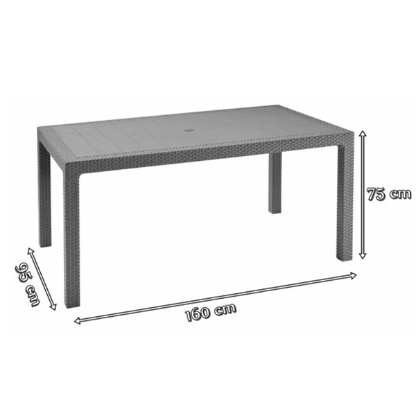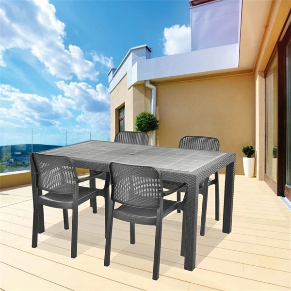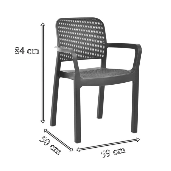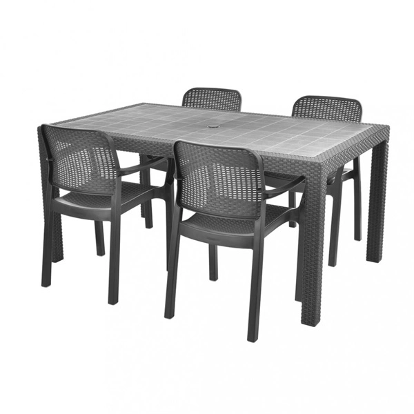 Négy székből és egy asztalból álló praktikus kerti bútor szett. Nagyon tartós műanyagból készült. Nagyon könnyen karbantartható és tisztítható. Ellenáll a kedvezőtlen időjárási körülményeknek és az UV-sugárzásnak. Az asztal méretei: Szélesség 157 cm, mélység 98 cm, magasság 74 cm. A fotel méretei: Szélesség 50 cm, mélység 59 cm, magasság 84 cm. Grafitszürke színű.